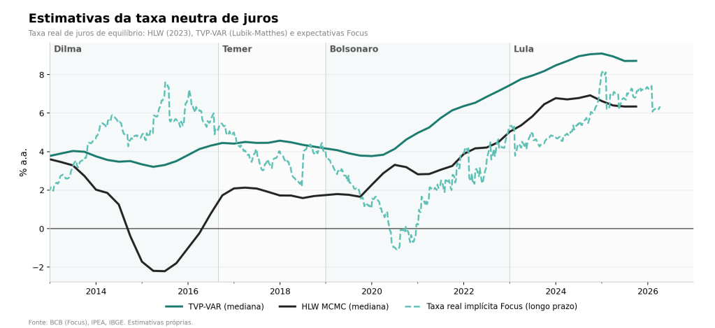 As estimativas atuais situam a taxa neutra entre 6% e 9% ao ano em termos reais — um intervalo amplo, mas que reflete a incerteza inerente à estimação de uma variável não observável.